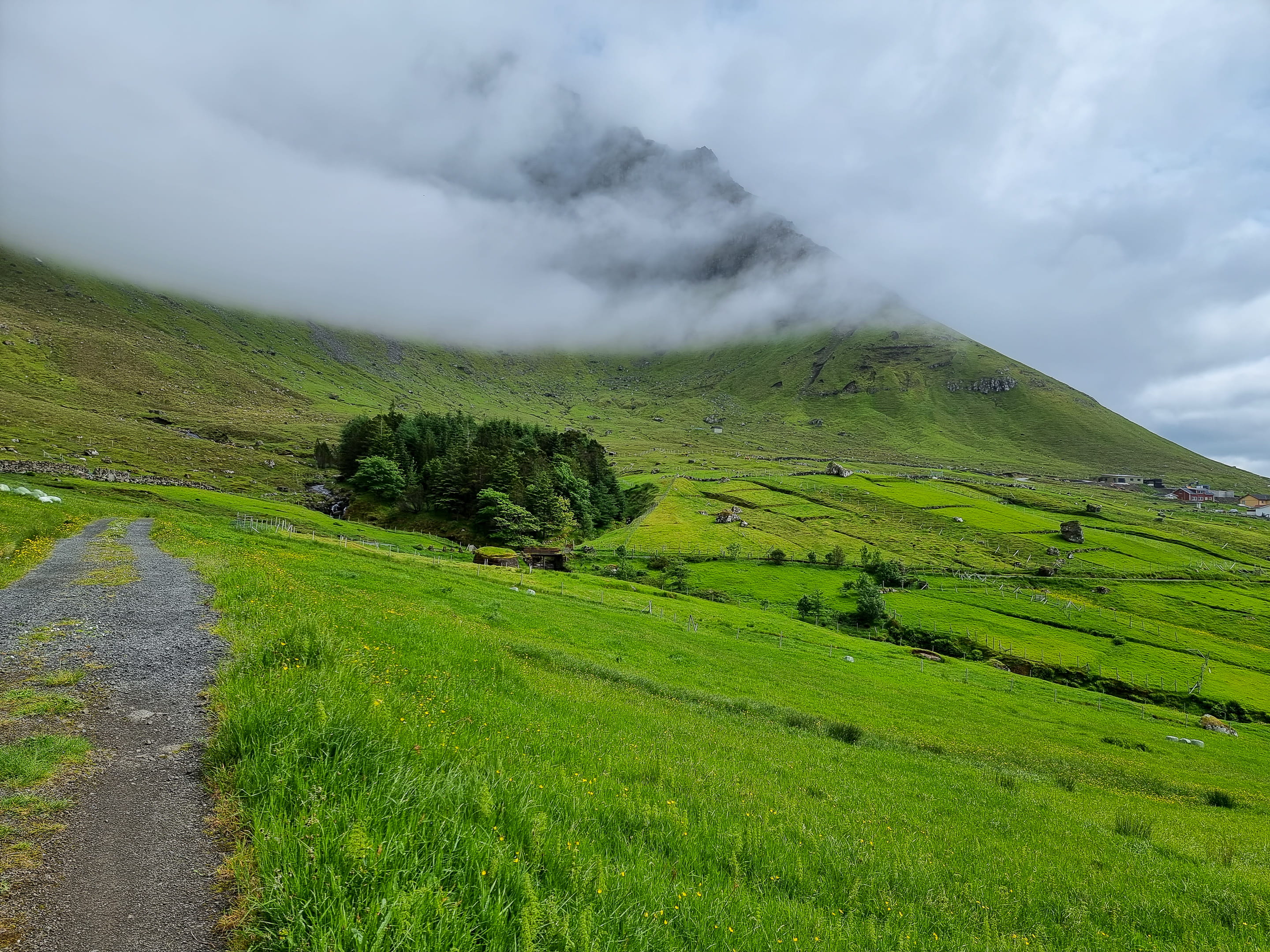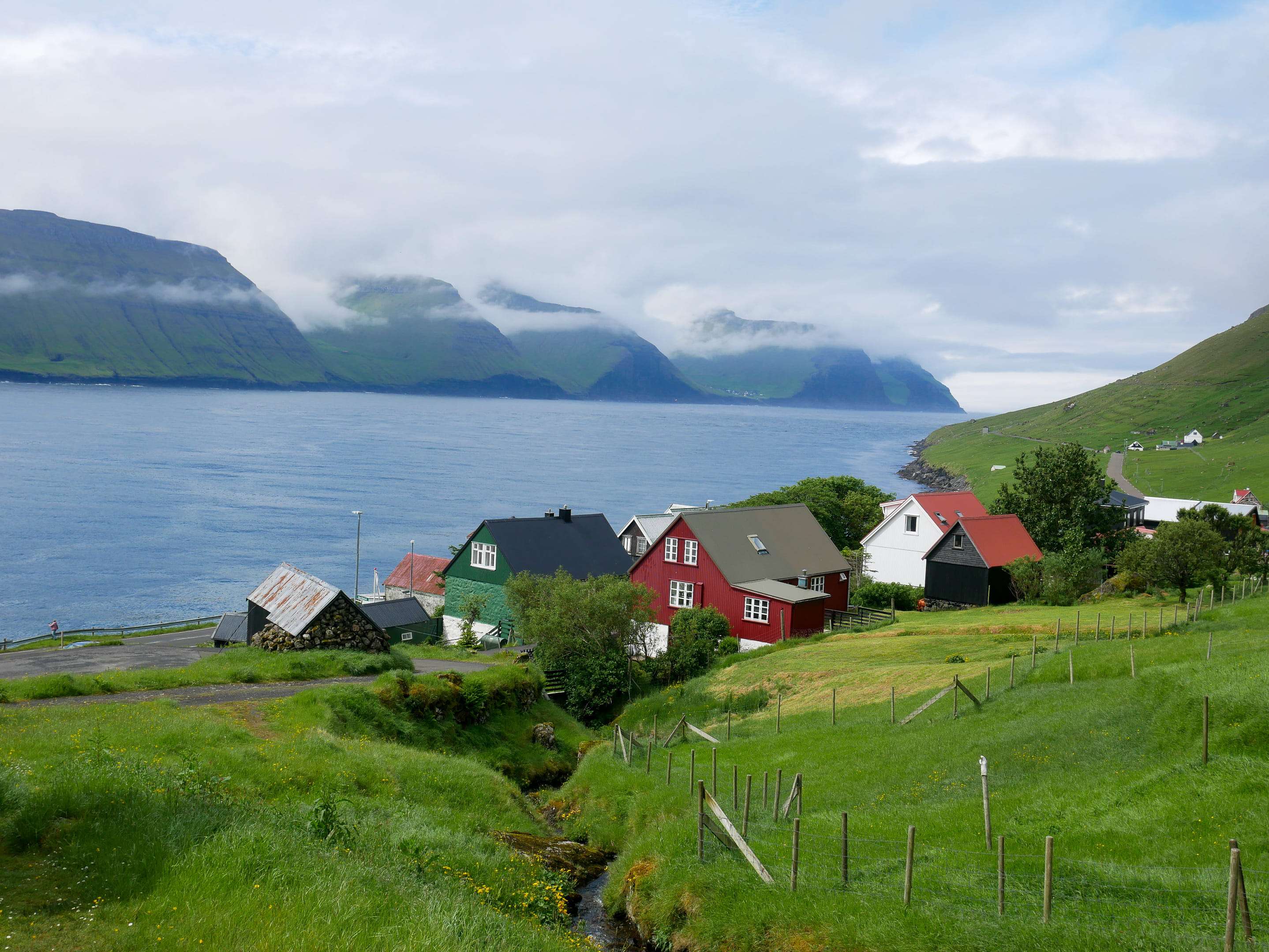 La vue de la ville depuis le port de Klaskvik sous le soleil, mais toujours cette tenace couche de nuages qui s’accroche aux sommets.
