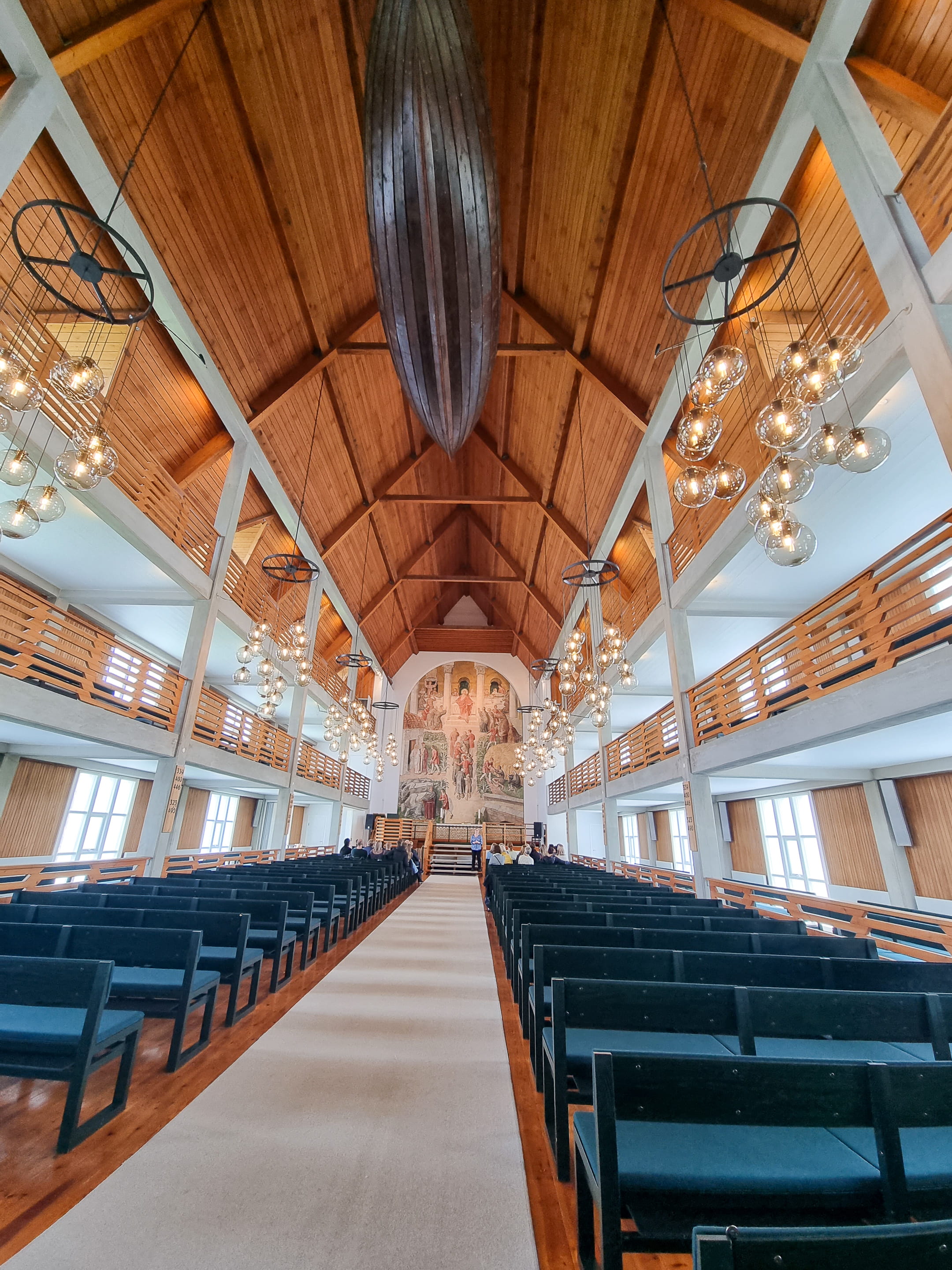 L’intérieur de l’église est assez étonnante. Il y fait bien chaud d’ailleurs, et l’atmosphère y est assez cosy, ça m’a un peu rappelé les églises en Angleterre. Le bateau accroché au plafond a sauvé de la noyade deux enfants et un viel homme, alors que le reste des équipages des bateaux avait péri ce jour-là dans un terrible naufrage. On n’a oublié de prendre une photo de l’extérieur, mais qui n’a rien de transcendant car très moderne.