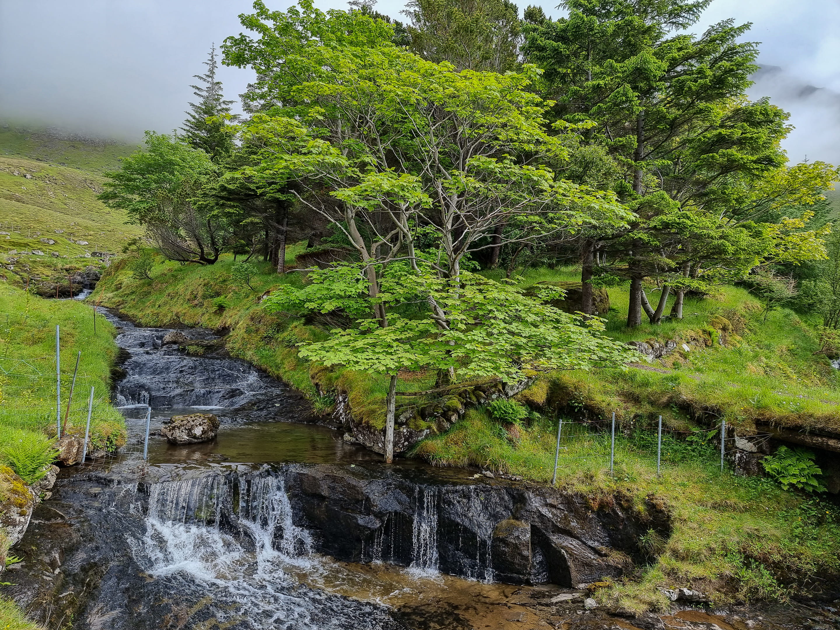 Nous partons ensuite visiter l’île de Kunoy et le village du même nom. Nous avons beaucoup apprécié ce petit village du bout du monde qui est encore habité et où on cultive même quelques rangs de pommes de terre. Il y a aussi une forêt préservée (on appelerait plutôt ça un bois qu’une forêt par chez nous, mais ici, il y a tellement peu d’arbres…). Une très jolie balade où le soleil a bien voulu se montrer cet après-midi là.