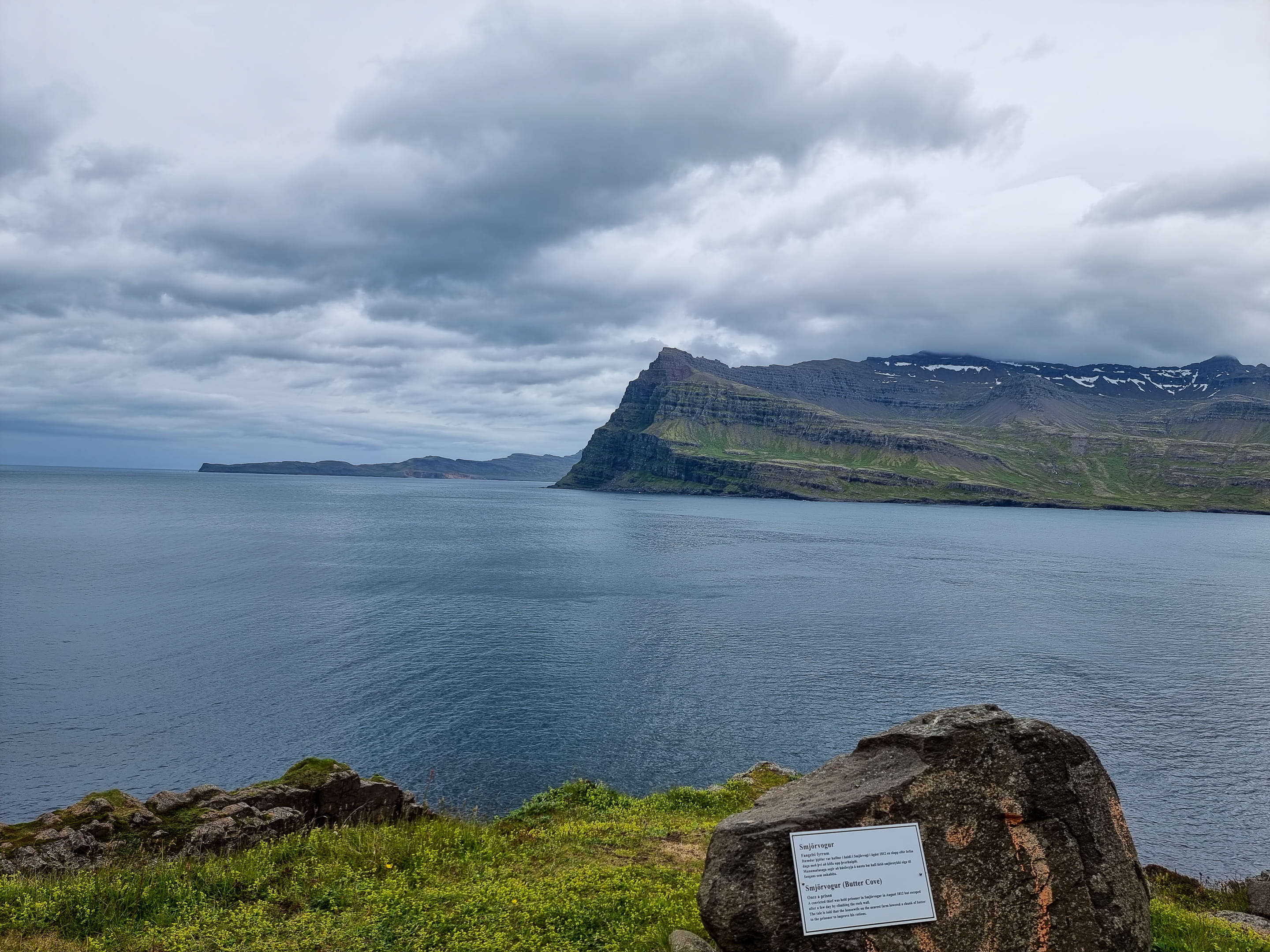 Un autre jour, nous nous rendons à Eskifjördur, un village de pêcheurs mais qui a sans doute perdu un peu de son charme d’antan. Aujourd’hui, c’est la pêche industrielle qui fait recette, il y a une grosse usine et des fermes à saumons dans le fjord. C’est aussi ça l’Islande. Nous avançons donc plus loin sur la rive nord du fjord, et nous tombons par hasard sur une mine de Spath (calcite cristaline), jadis exploitée. C’est une pierre transparente, qui était utilisée par les vikings pour naviguer en mer, ça leur permettait de voir où était le soleil à travers les nuages et donc de pouvoir s’orienter. Cette pierre a aussi été essentielle dans l’amélioration des microscopes au milieu du XXème. Nous avons fait quelques pas dans la grotte creusée pour extraire la pierre, un endroit sombre et humide, pas franchement accueillant. Il y avait un vent assez fort, nous n’avons donc pas fait beaucoup de photo.