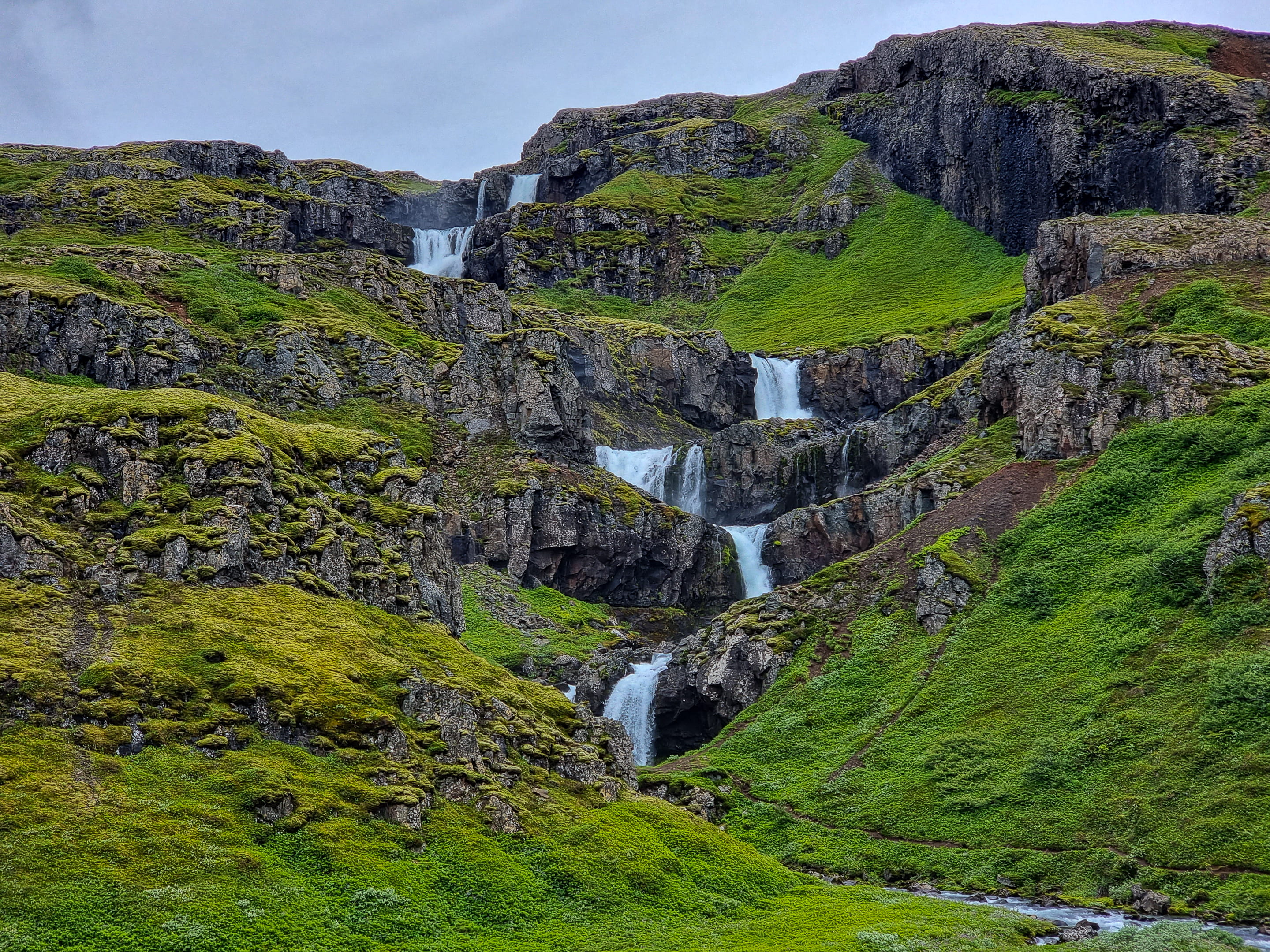 Nous commençons donc notre périple en Islande par les fjords de l’est, la partie la plus verte de l’Islande à en croire les guides. Nous avons commencé par voir les cascades de Hengifoss et Litlanesfoss non loin du lac Lögurinn. Ce lac serait habité par un monstre aquatique selon la légende, nous, on a rien vu !