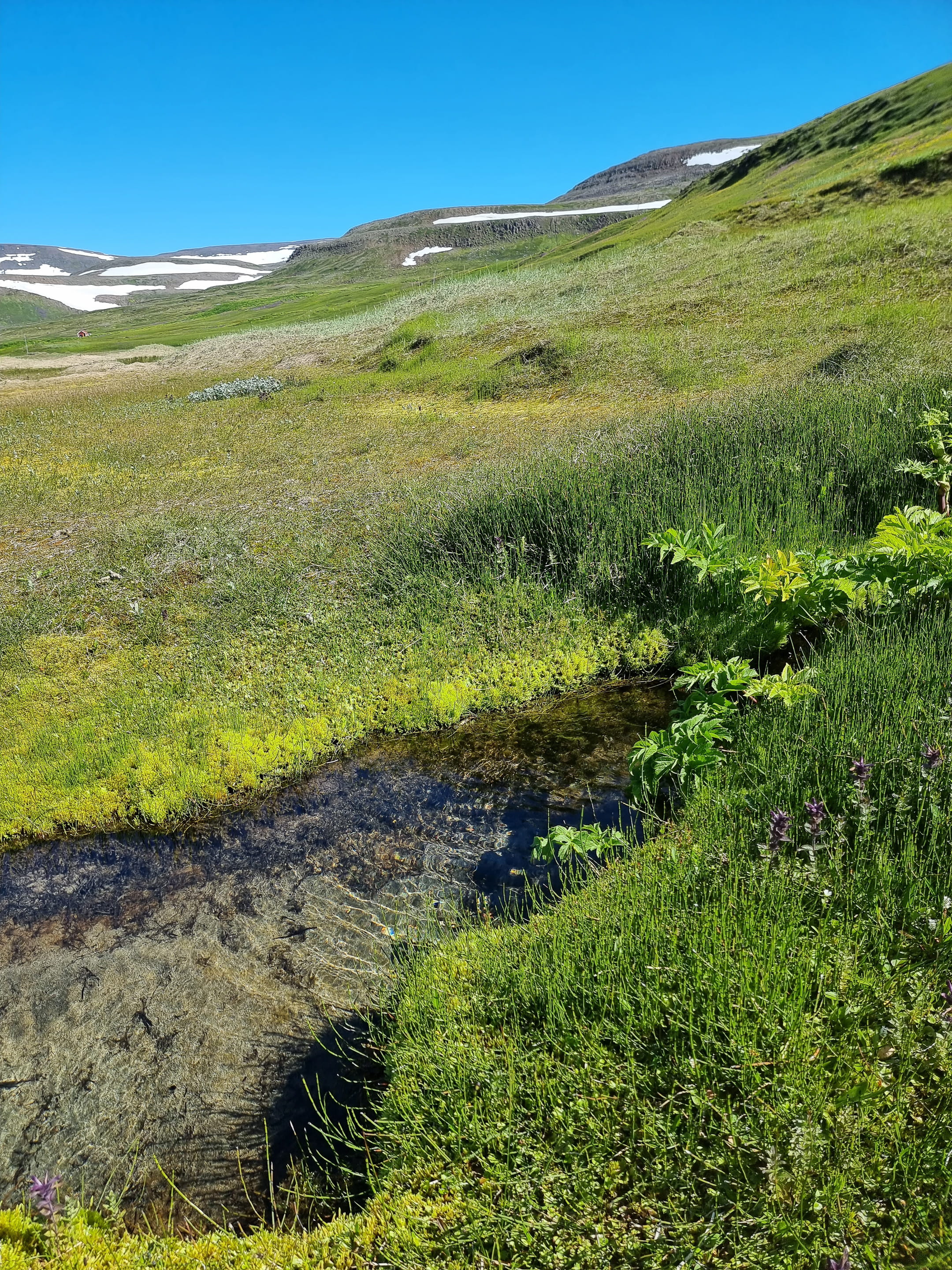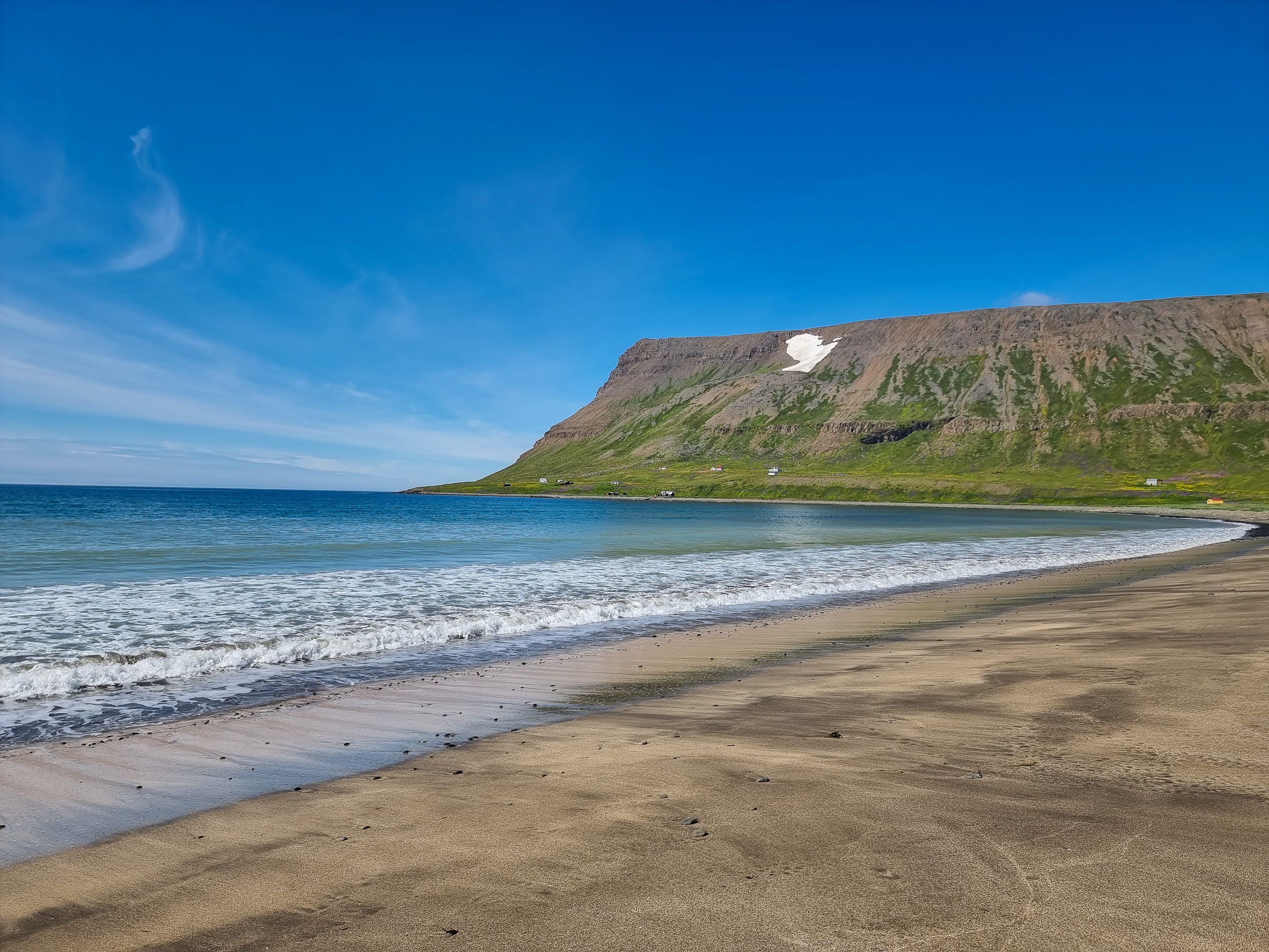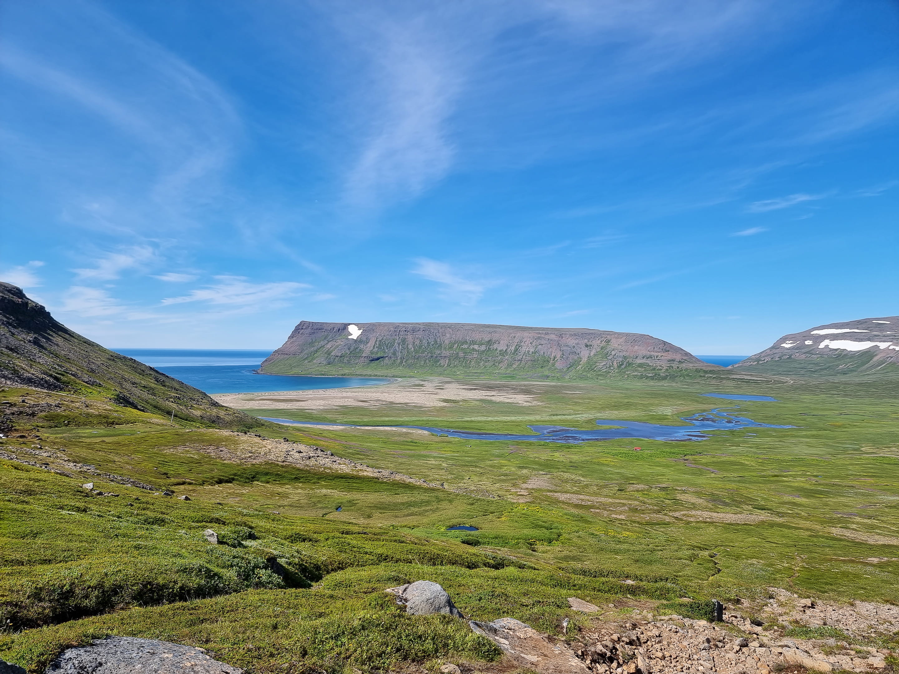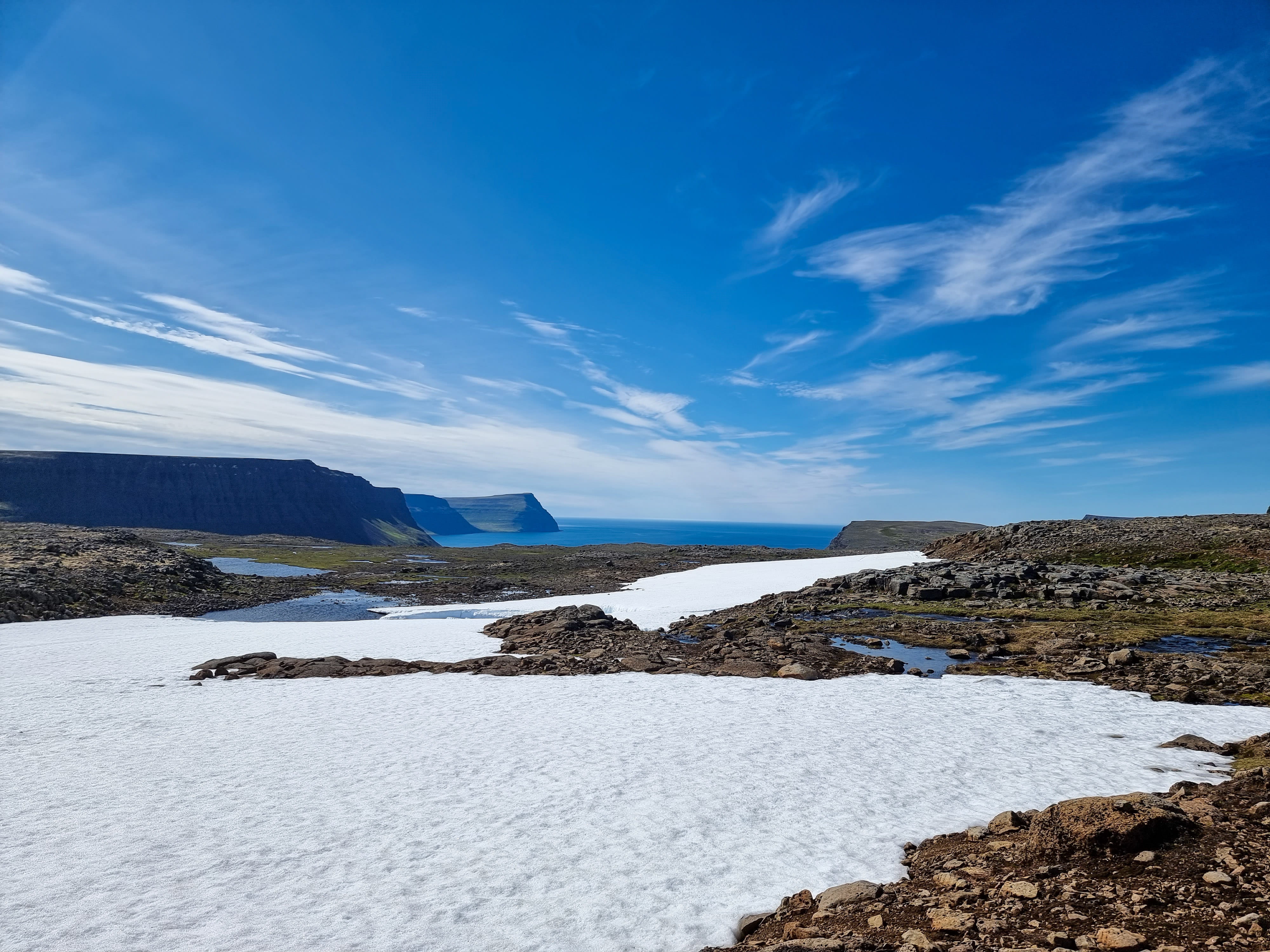 Le capitaine nous informe rapidement qu’il a un souci de planning et que nous devrons absolument reprendre le bateau de 16h pour rentrer au lieu de 18h. On croise les doigts pour avoir assez de temps. Après 1h de traversée, nous arrivons à Aðalvík à midi. Le soleil illumine la baie : l’eau turquoise scintille et les herbes hautes sont d’un vert éclatant. Une fois le bateau parti, on est frappé par le silence qui règne ici. La randonnée démarre en longeant la plage. Nous apercevons quelques traces de pas du fameux renard polaire, mais il ne se montre pas. On est époustouflé par la beauté et la pureté des paysages. Puis, on remonte le ruisseau, laissant la baie turquoise derrière nous. Une fois arrivés en haut de la colline/montagne (900 mètres d’altitude, on n’est pas non plus en train de gravir l’Everest!), on arrive sur un plateau de roche et de neige ! Et il en reste une belle épaisseur par endroit. On a dépassé les deux heures de marche, mais pas encore la moitié des kilomètres… Arriver avant 16h de l’autre côté semble de plus en plus incertain à ce stade.