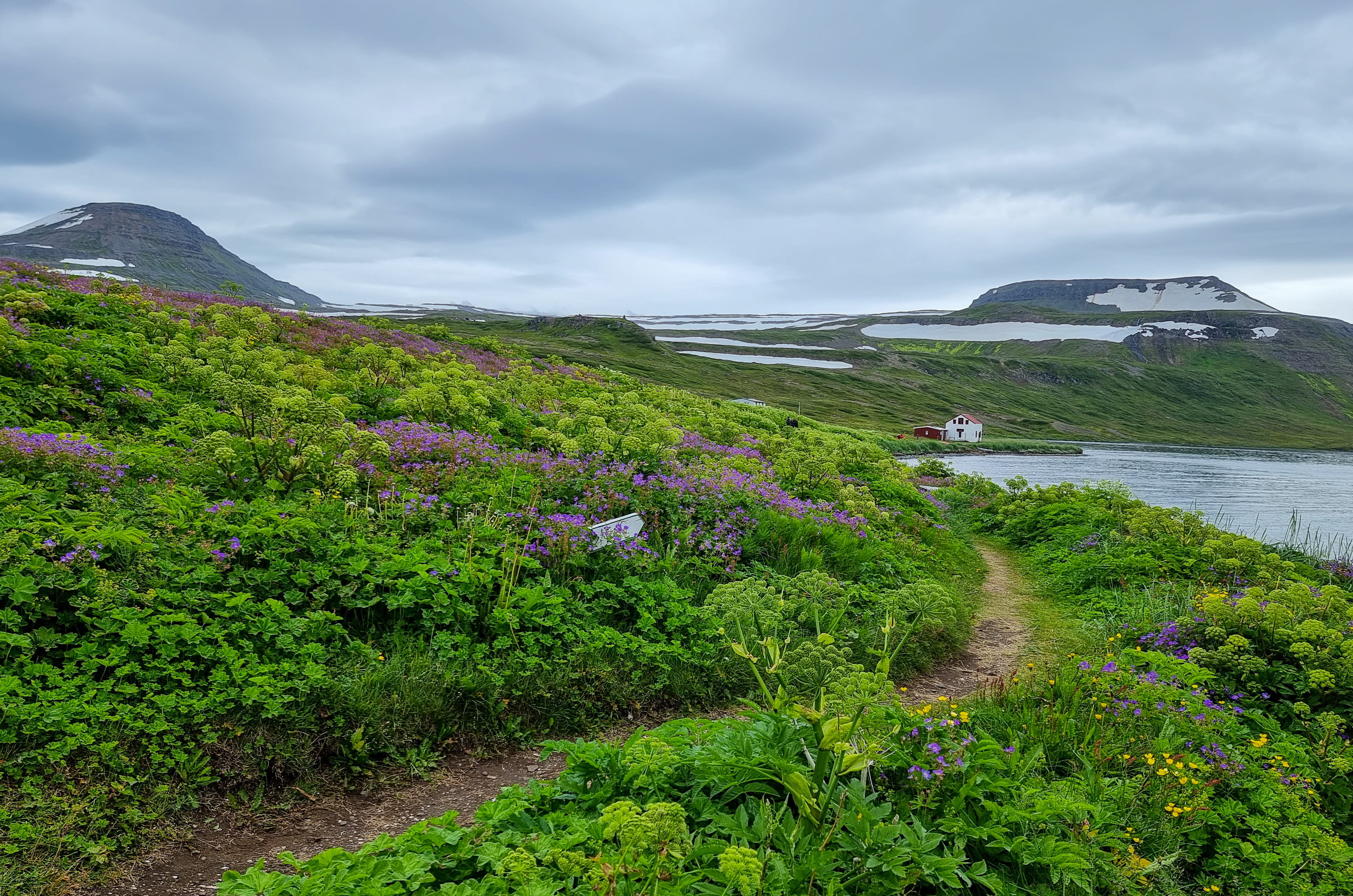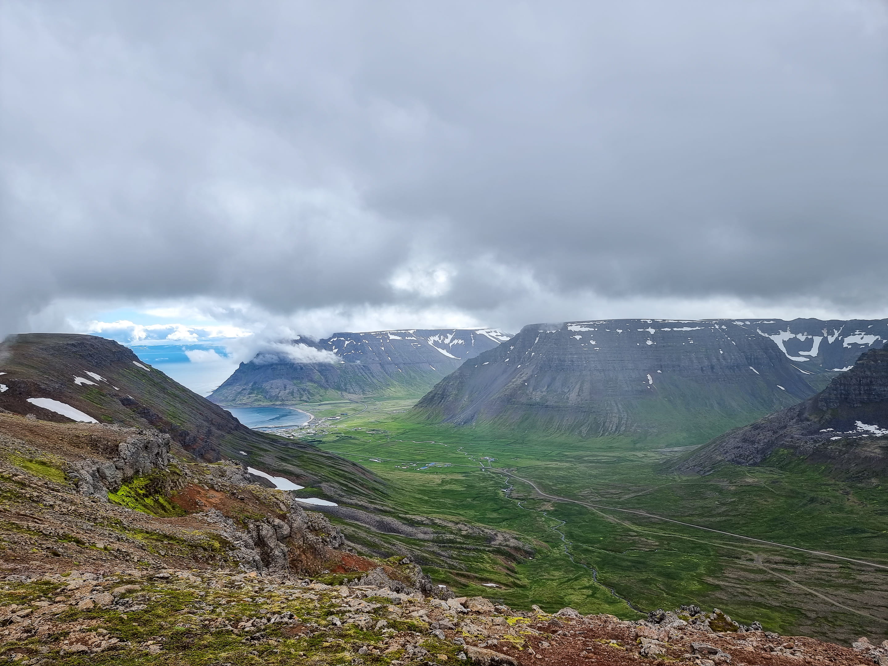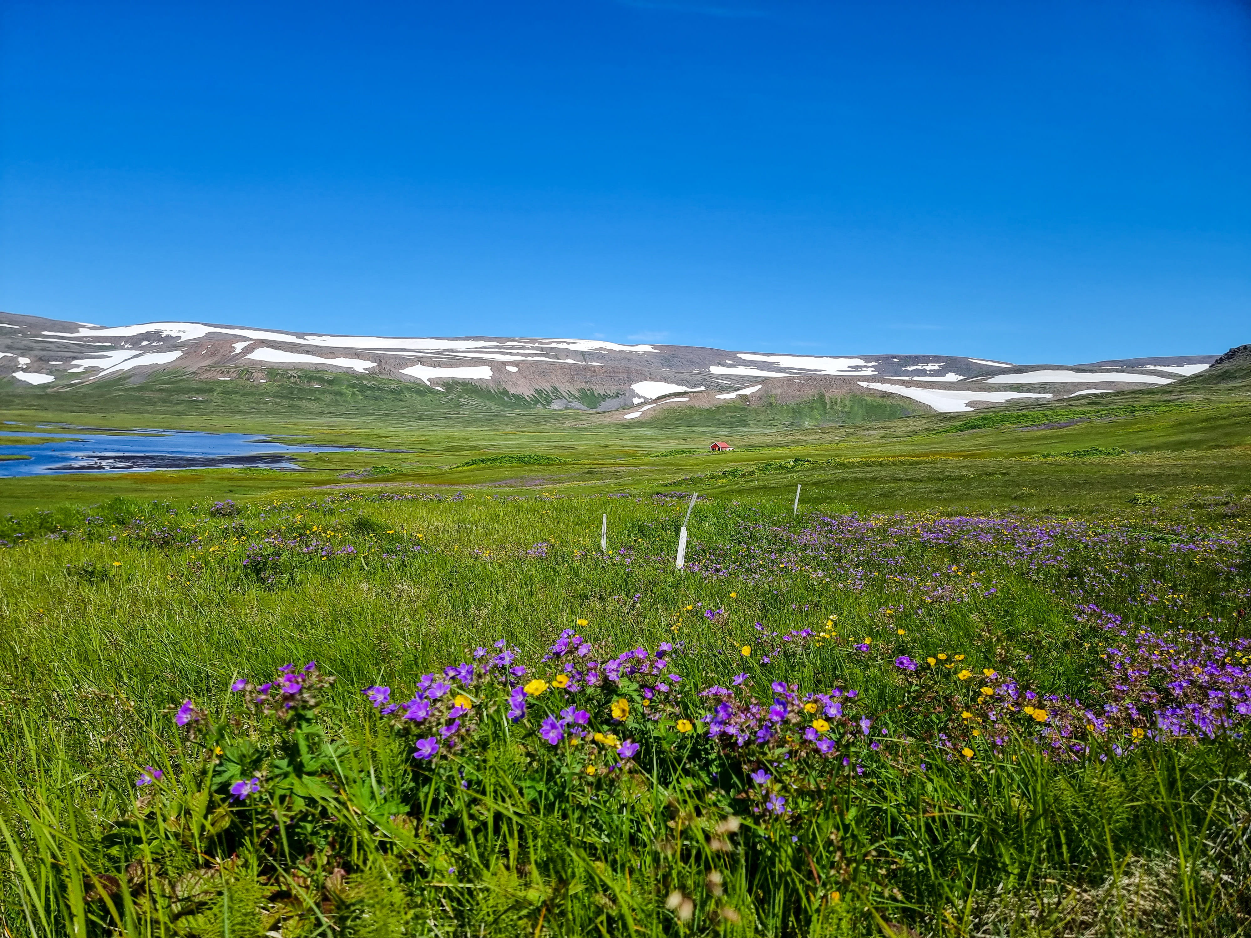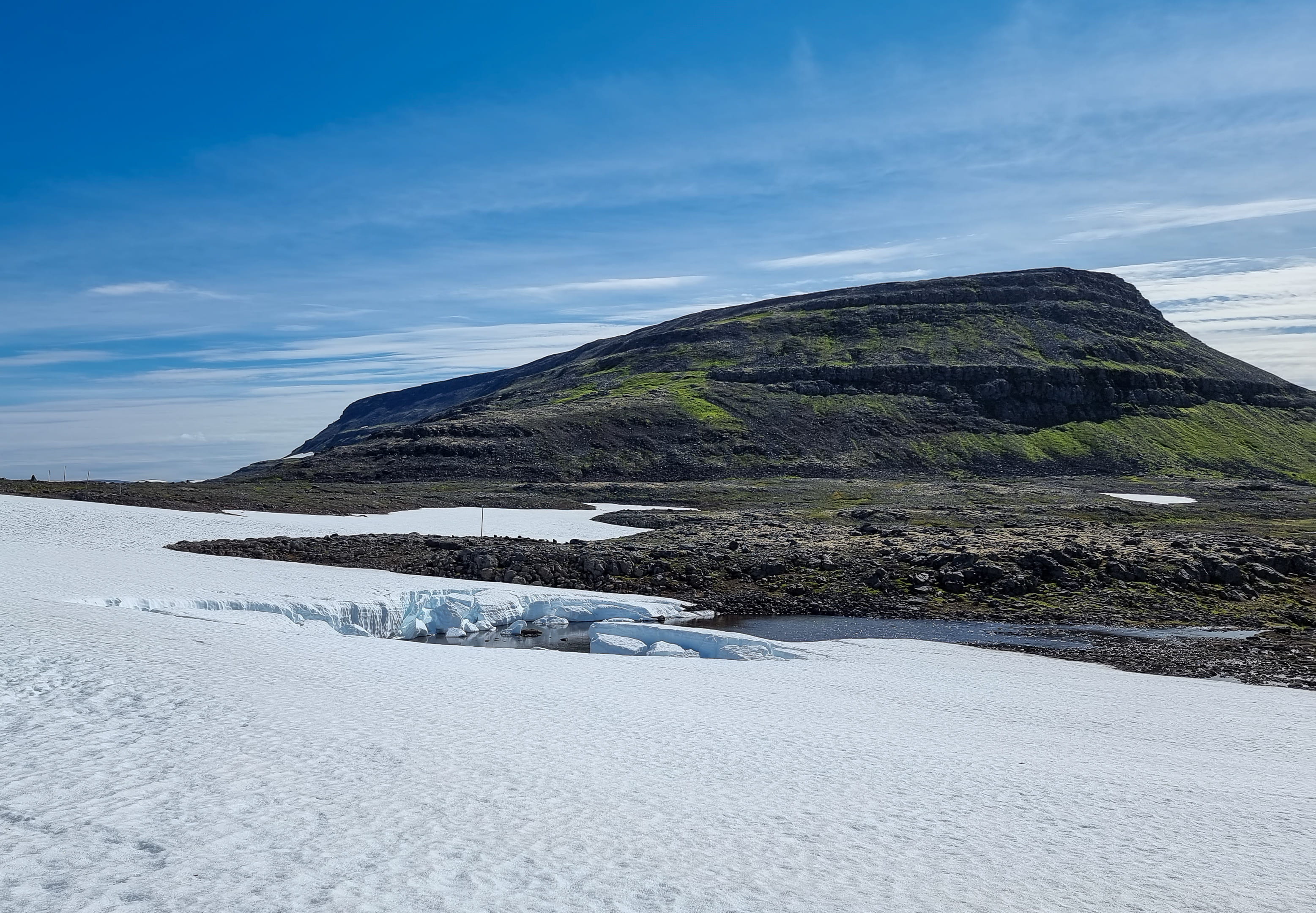 Le capitaine nous informe rapidement qu’il a un souci de planning et que nous devrons absolument reprendre le bateau de 16h pour rentrer au lieu de 18h. On croise les doigts pour avoir assez de temps. Après 1h de traversée, nous arrivons à Aðalvík à midi. Le soleil illumine la baie : l’eau turquoise scintille et les herbes hautes sont d’un vert éclatant. Une fois le bateau parti, on est frappé par le silence qui règne ici. La randonnée démarre en longeant la plage. Nous apercevons quelques traces de pas du fameux renard polaire, mais il ne se montre pas. On est époustouflé par la beauté et la pureté des paysages. Puis, on remonte le ruisseau, laissant la baie turquoise derrière nous. Une fois arrivés en haut de la colline/montagne (900 mètres d’altitude, on n’est pas non plus en train de gravir l’Everest!), on arrive sur un plateau de roche et de neige ! Et il en reste une belle épaisseur par endroit. On a dépassé les deux heures de marche, mais pas encore la moitié des kilomètres… Arriver avant 16h de l’autre côté semble de plus en plus incertain à ce stade.