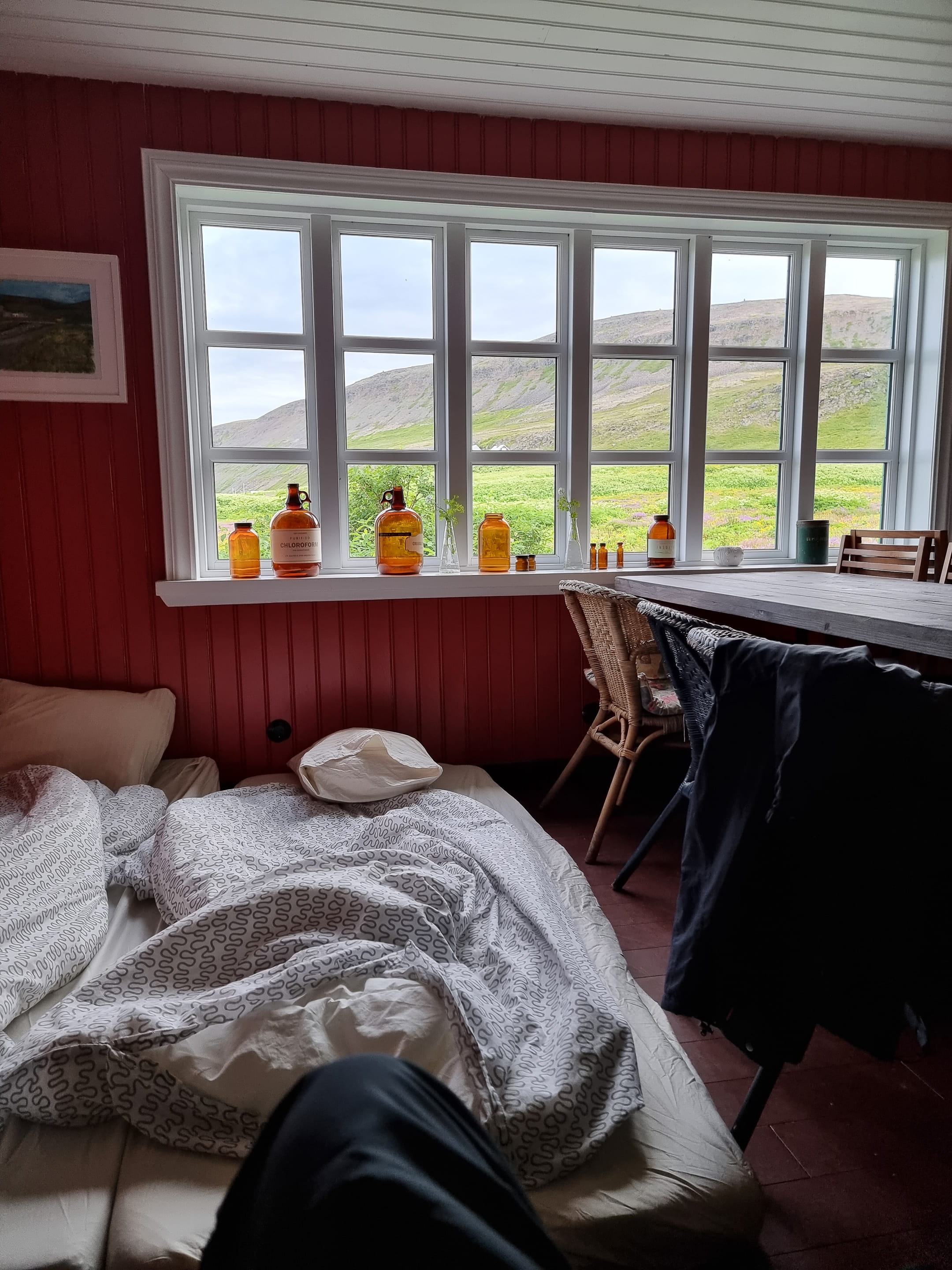 Enfin, on arrive à Hesteyri après moins de 4h45 de marche, nous apprenons que le bateau est parti parce qu’un groupe particulièrement insistant voulait avant 16h !! Nous expliquons la situation au propriétaire de l’auberge « Old Doctor’s House » qui n’est autre que le frère du capitaine, il est calme et souriant. Il nous propose donc que l’on dorme sur des matelas dans un coin d’une des petites salles à manger. Nous sommes donc ici pour une nuit, voilà qui est plus qu’inattendu !
