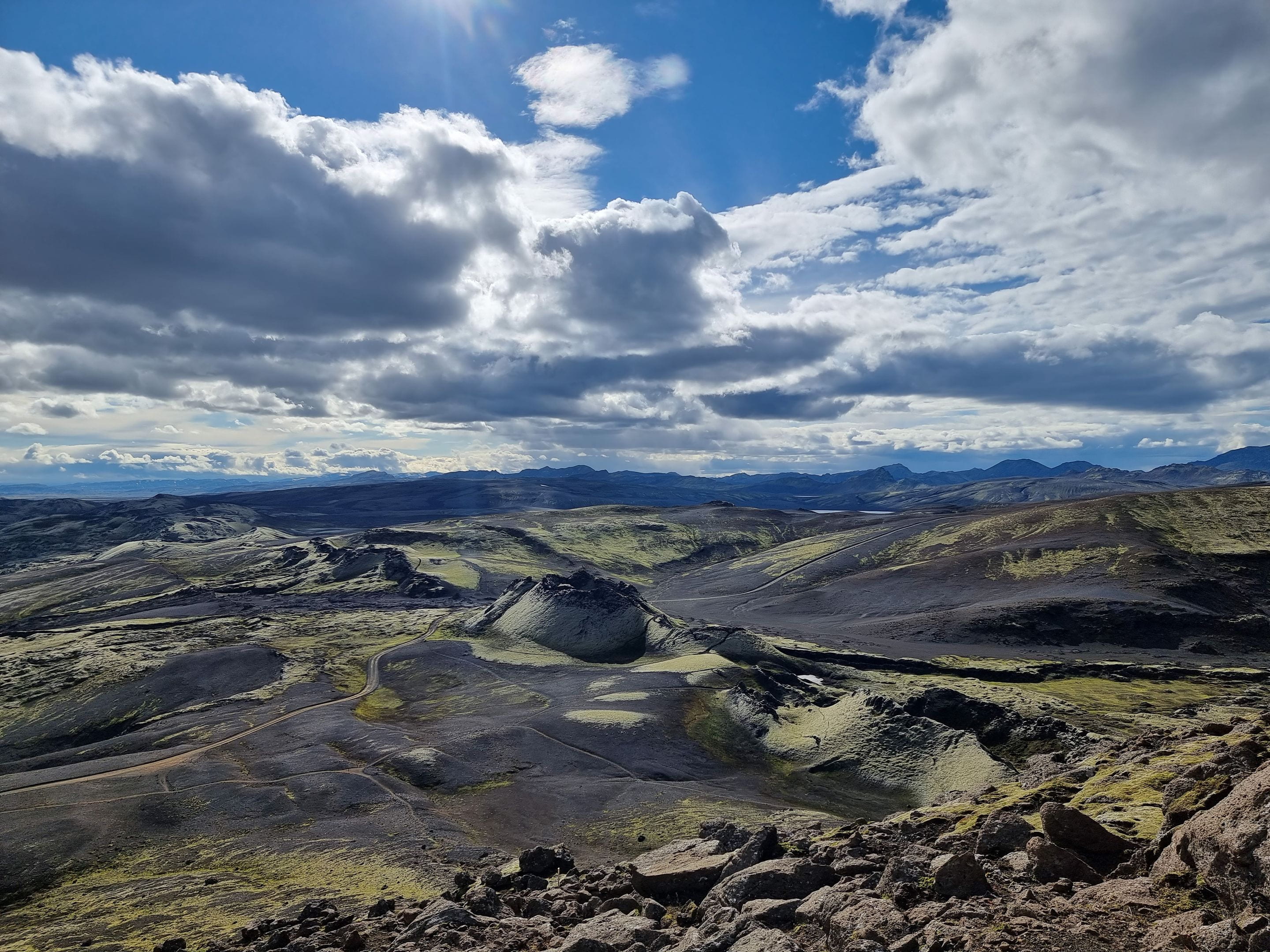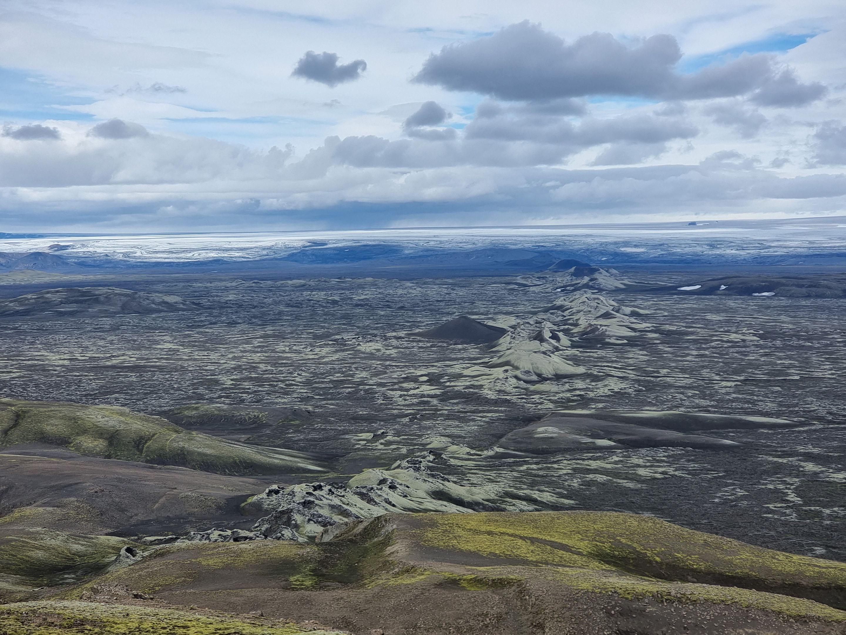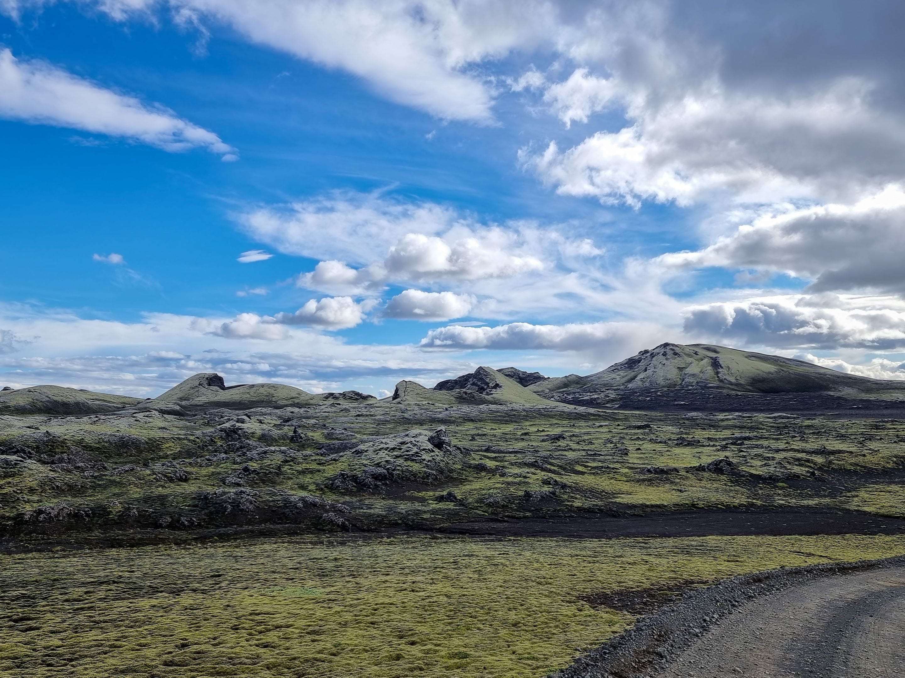 Nous continuons notre route au sud du pays et nous faisons un détour en prenant la piste F206 vers le Lakagígar. C’est une chaine de cratères d’une trentaine de kilomètres qui explosa en 1783 et resta en éruption pendant près d’un an. Ce fut une catastrophe terrible pour l’Islande et même pour l’Europe. Il y eut près de 10 000 morts en Islande, et le ciel s’assombrit dans toute l’Europe causant de mauvaises récoltes et des famines. La température baissa aussi fortement. On dit que cet évènement est à l’origine de la révolution française quelques années plus tard.